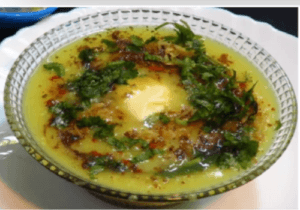 Moong Dal (Yellow Moong), Salt to taste. For dressing – Chopped onion, sliced garlic, green chilli, roasted cumin powder, butter, lemon , chopped coriander leaves.